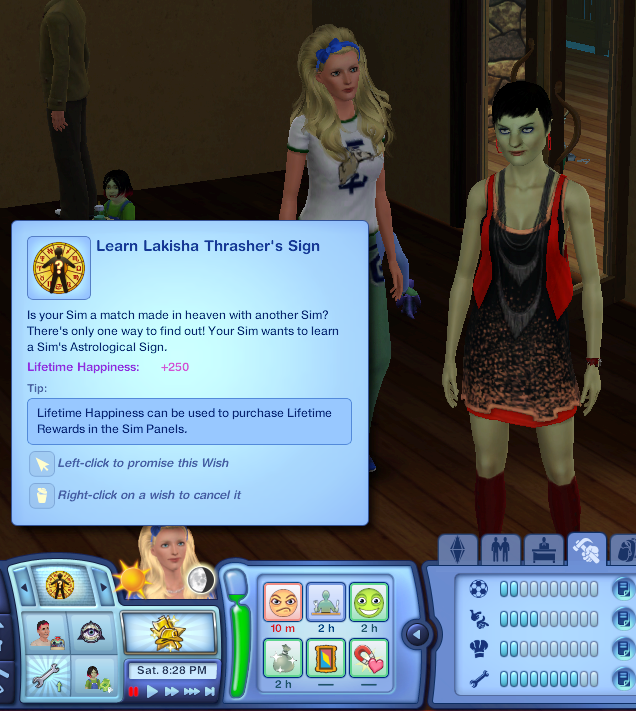 Also, he hasn’t done anything to demonstrate it, but Christof’s sudden attack of studiousness and my strategic use of the “Work Hard” school tone actually got him an A in elementary school. (But not honor roll, so no points :-p.) That shocked me because it was so rapid. He had a straight C until a couple of days before aging up, then suddenly started both doing his homework and going to bed so that his mood was actually high enough to Work Hard for some part of the school day. At any rate, he actually got his Insane trait this time around, and I have a full set.  I’m starting to think that there should be points for the Insane thing — either losing points if a kid makes it to adulthood without Insane or gaining them if the whole generation gets the trait.
